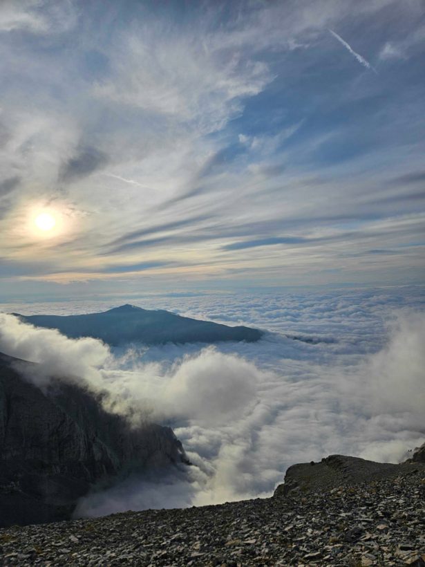 After a while, we started ascending above the clouds. Suddenly, the sky opened up and we could see the sea of fog below us. It felt like the mountain was welcoming us. The view was incredible, but what really lifted my mood was spotting the refuge in the distance. Seeing it after hours of hiking felt like a reward. Fortunately, since we arrived early at the refuge of Kakalos and there was a cancellation of a big group, we managed to find some beds to spend the night there. The alternative would be to spend the night outside in our tents at -2°C.