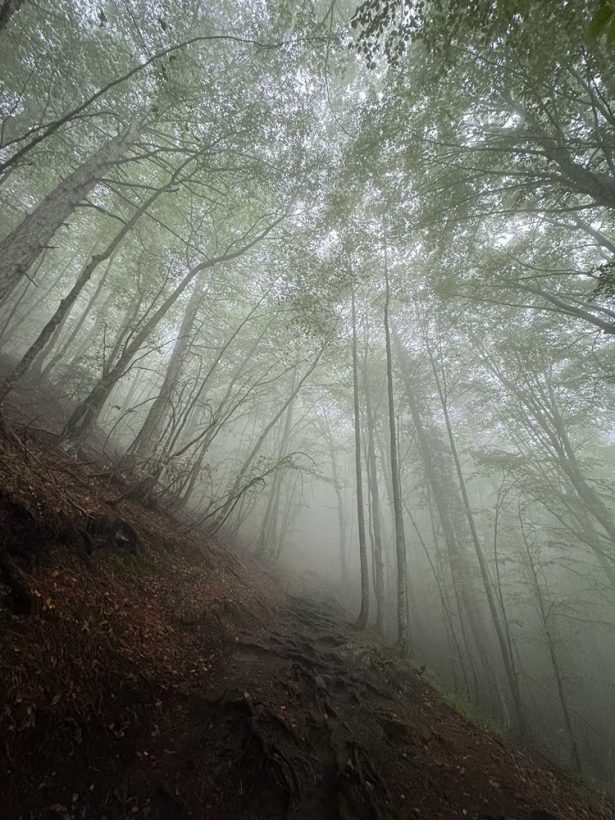 We stayed in Litochoro the first night and started the ascent early the next morning from Gorchia (I don’t know how to spell it in english :P). The weather wasn’t exactly on our side — the forecast had been warning us about rain and snow all week. Sure enough, as soon as we began, we found ourselves surrounded by thick fog and light rain. Strangely, I enjoyed it. The mist gave the forest a mysterious feel, like we were walking through another world. It was cold and humid, but that only made it more refreshing. Since it was still the start of the hike, our spirits were high and we just laughed it off.